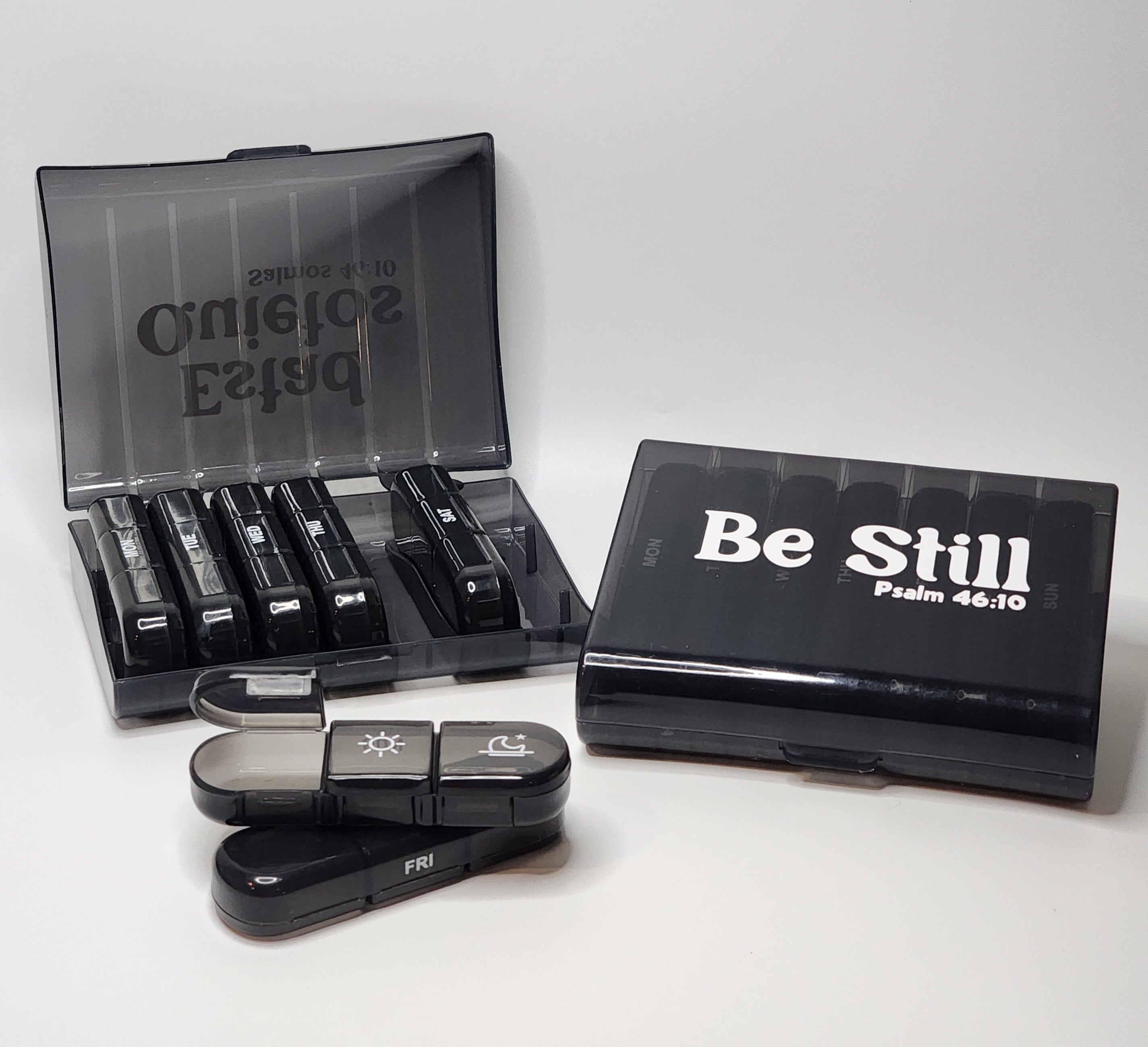 1 pastillero; diseñado para ayudarle a mantenerse al día con el día actual de sus medicamentos, vitaminas o suplementos. 7 días a la semana, 3 veces al día. Siempre con el recordatorio de estar quietos y confiar en Dios.